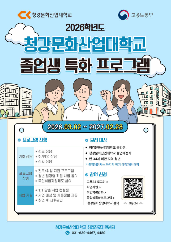 2026학년도 졸업생 특화 프로그램 운영을 위한 수요조사를 진행하고 있습니다. 학생 여러분의 의견을 반영하여 프로그램을 기획하고자 하오니 많은 참여 부탁드립니다.