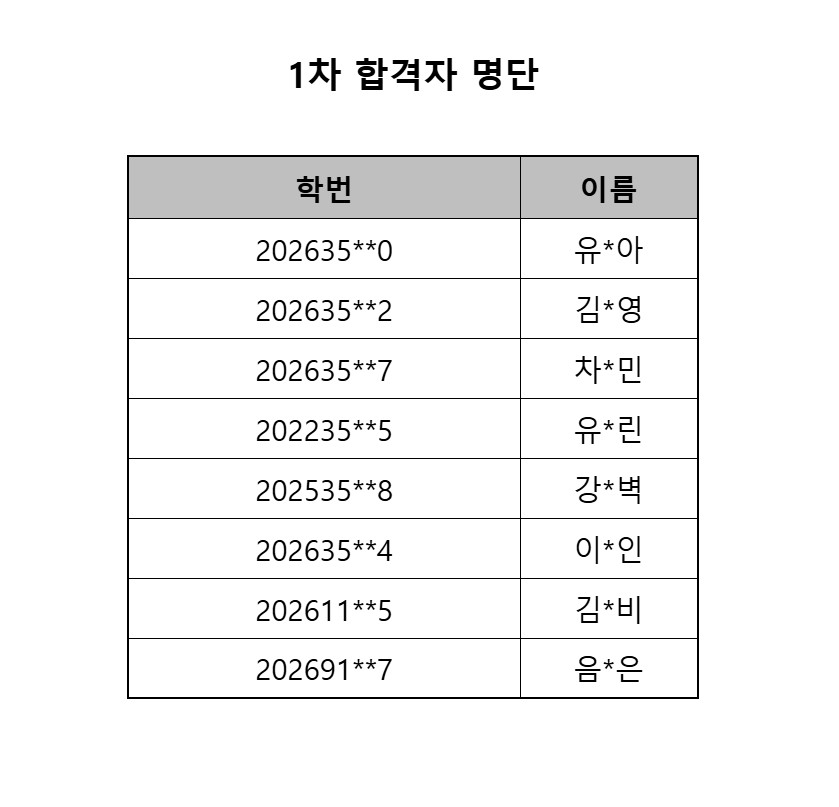 1차 합격자 명단은 아래와 같습니다.