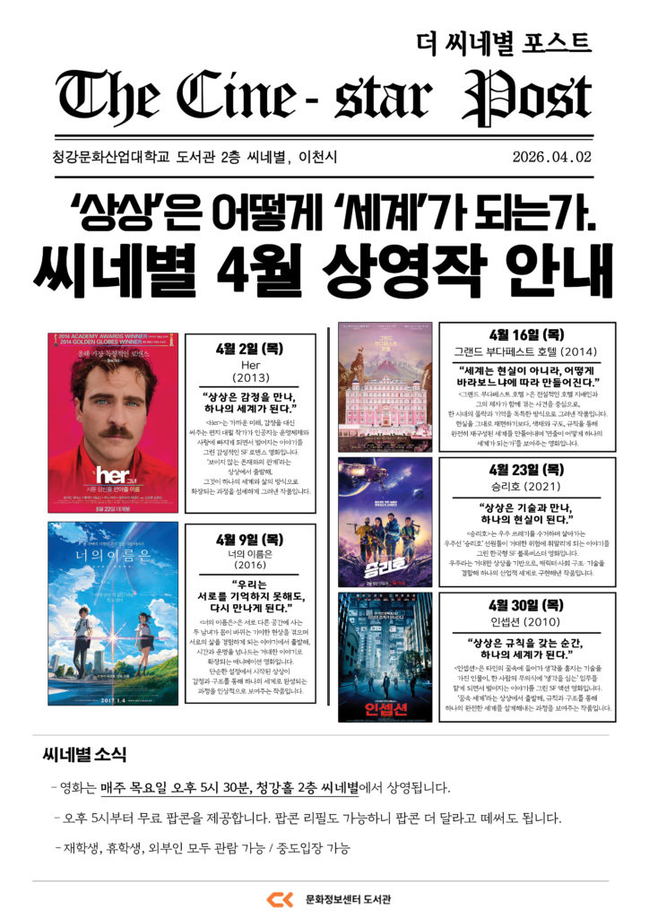 이번 4월은 “‘상상’은 어떻게 ‘세계’가 되는가”이라는 주제로 라인업을 구성하였습니다. 누군가의 ‘상상’이 하나의 ‘세계’가 되어가는 과정을 시각화한 영화들을 통해, 우리 대학 학생들과 교수님들이 새로운 영감을 얻는 시간이 되길 바랍니다! [4월 퀴즈 이벤트] 아래 링크로 접속하셔서 정답을 작성해주세요. 추첨을 통해 정답을 맞추신 총 10분께 상품을 드립니다. 씨네별 4월 영화 상영 프로그램 퀴즈 바로가기 >>퀴즈 응모