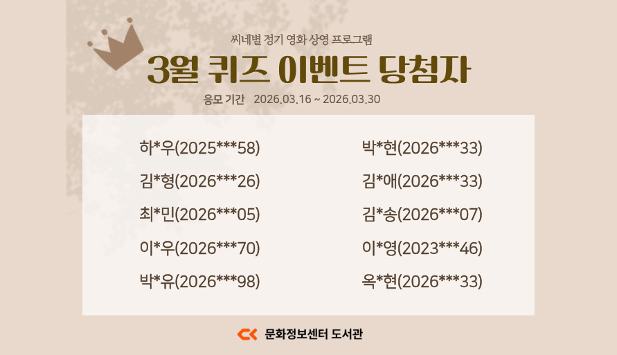 3월 당첨자 10분께는 3월 31일 16:00 이후 쿨투라 모바일 상품권이 발송됩니다. 감사합니다. |